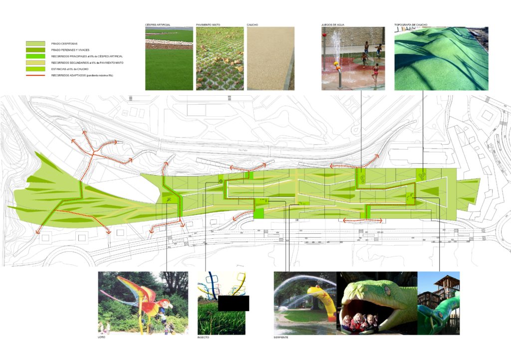 Los juegos se complementaran con otras áreas donde mediante una topografía artificial se harán montículos por los que trepar, o con fuentes de agua que refrescaran al paseante en verano.