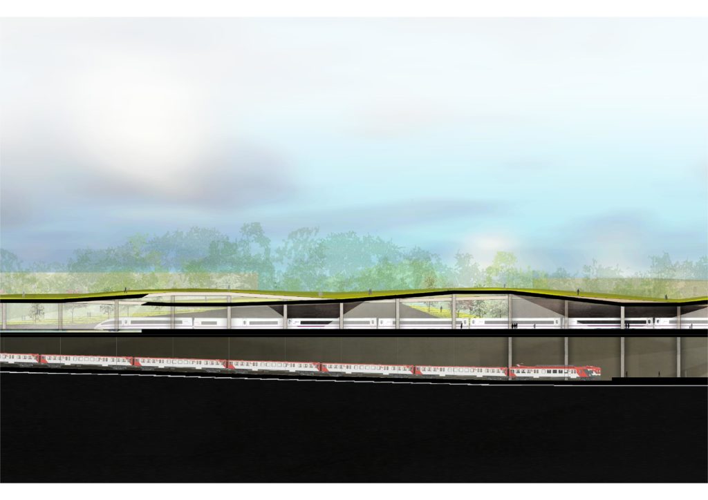 Este aspecto debe tenerse muy en cuenta de cara a su diseño como un tapiz verde de diferentes tonos y texturas que se superpone sobre las cubiertas de la estación, que se funde en continuidad con el actual Parque de Moreda y que remata con Sanz Crespo.
